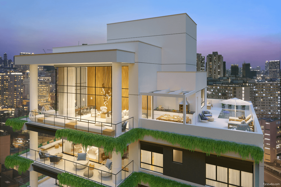 Descrição: Edifício residencial, plantas entre 290 a 525 m², com 4 quartos, 4 banheiros e 4 e 6 vagas